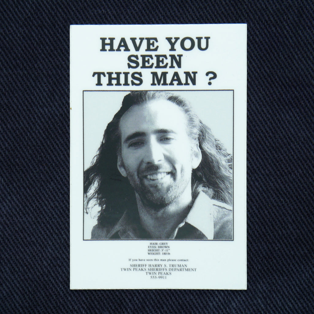 Have you seen the man? The one and only Nicolas Cage, wanted by Twin Peaks. Make sure all your friends know who to look out for with this vinyl sticker. Put it on your laptop, water bottle, or wall - wherever you can find a laugh!