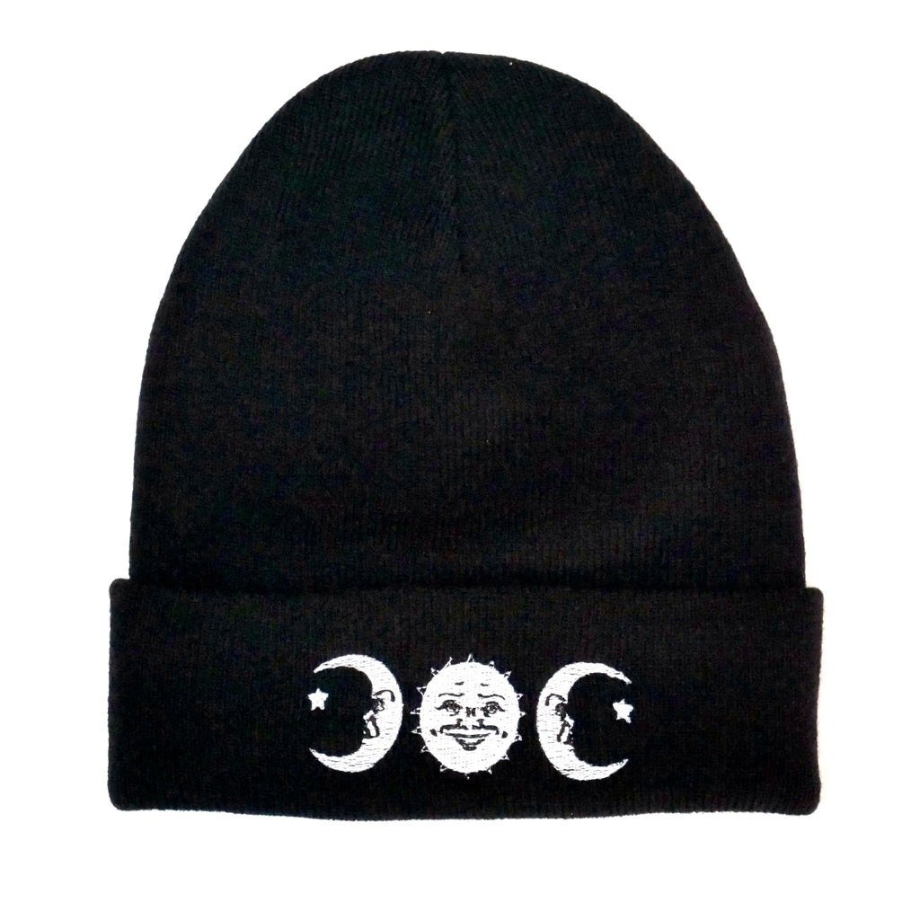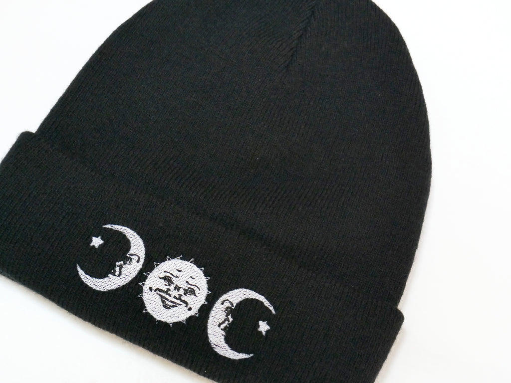 Soft warm beanie with embroidered ouija board sun and two moons, giving a triple moon style design