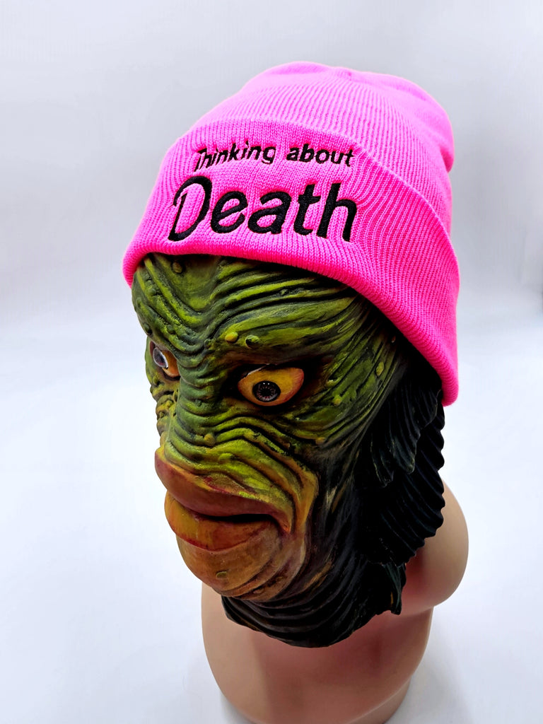 Just sitting here thinking about death, you know. This hot pink knit beanie might be having an existential crisis but it's looking good while it does! "Thinking about Death" in black embroidered font