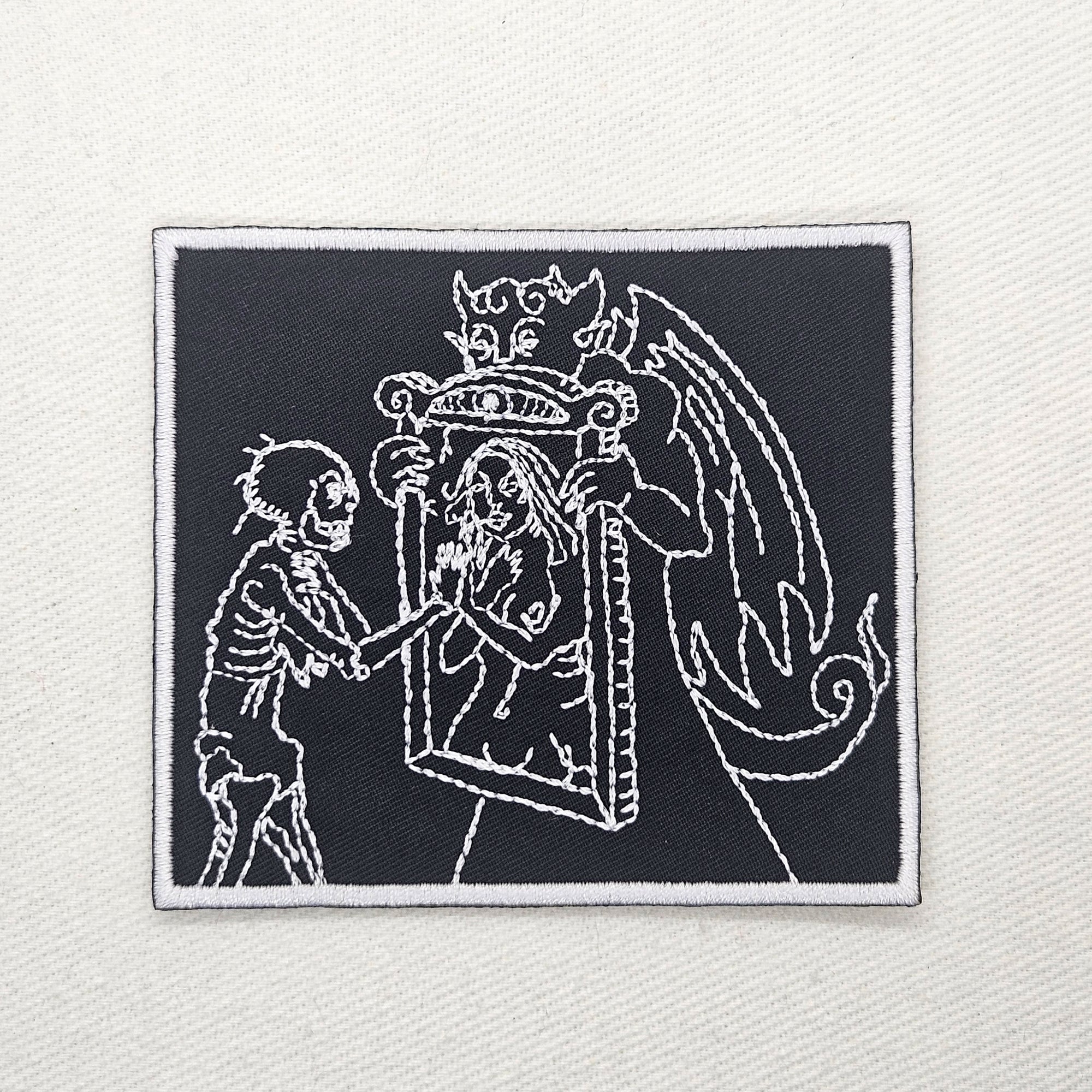 This patch design features a classic woodcut style art piece with a skeleton looking at its reflection in a mirror...
