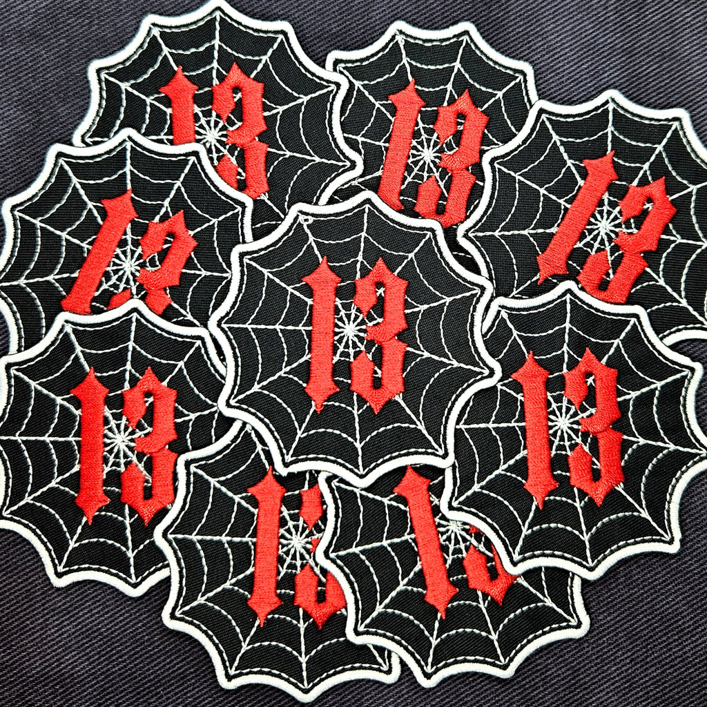 A lucky red 13 in the middle of a spiderweb for a classic style! Whether you like rock, punk, metal, rockabilly, psychobilly, or you're just plain cool, this iron on embroidered patch is for you!