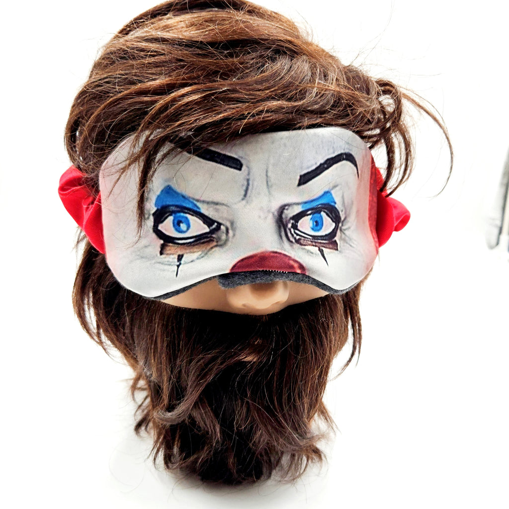 Rest in peace knowing you have this sleeping mask on. Clown eyes staring out into the world while you rest and everyone is too afraid to bother you! *back side photo is for reference, this mask features a red band around the head
