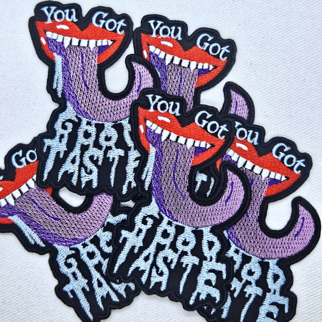 For those who got that good taste! From the Cramps song to patch form, this embroidered iron on patch features a vampire style mouth with fangs and a drooling purple tongue for a monster like look.